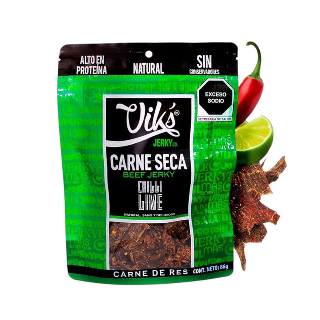 Viks Jerky Chili Lime is a jerky marinated in a blend of spices and lemon , made with high-quality beef and dehydrated to preserve its flavor and texture. It's a high-protein, low-fat snack, ideal for those looking for a tasty, convenient, and energy-packed snack.