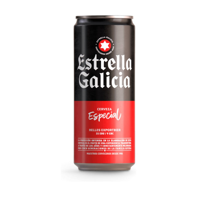 Estrella Galicia Especial is a premium lager brewed in Galicia, Spain, with over a century of brewing tradition. Crafted with spring water , roasted barley malt , and noble hops , it offers a perfect balance of freshness, body, and bitterness. Its authentic character and its brewing process with natural ingredients make it a versatile beer, ideal for those seeking quality and flavor in every sip.